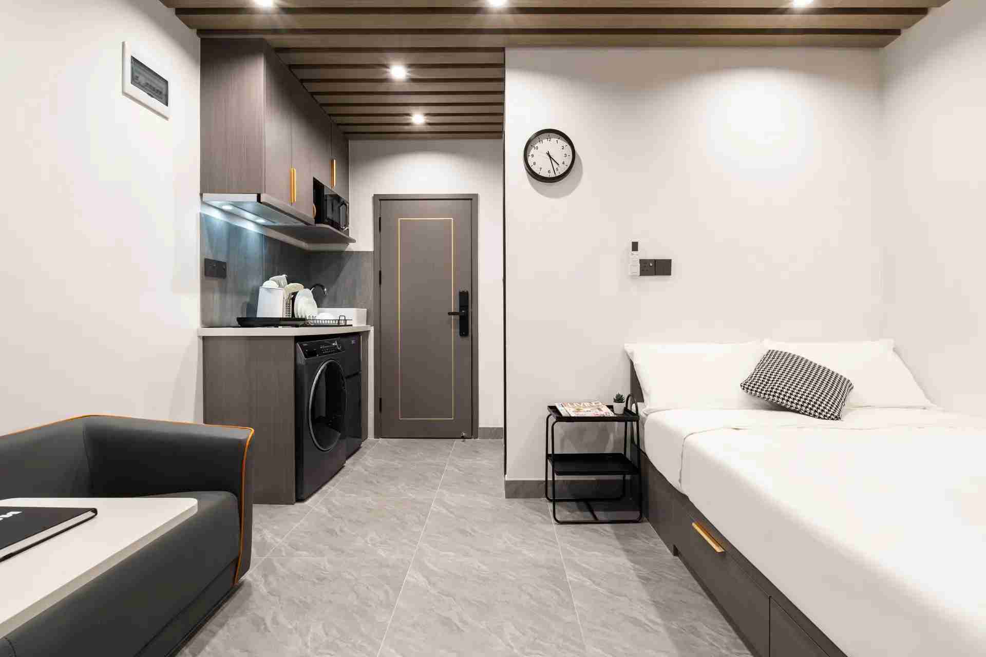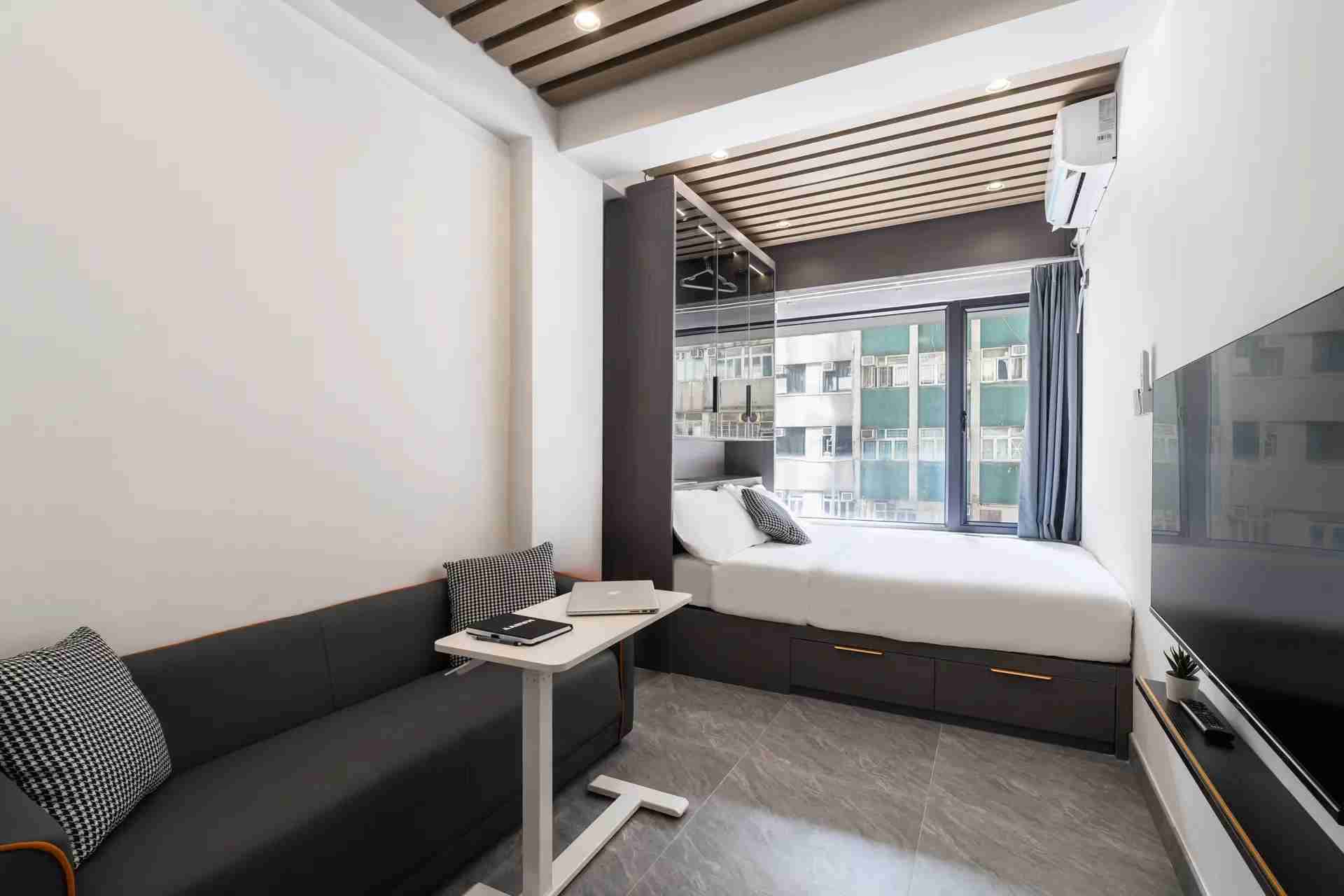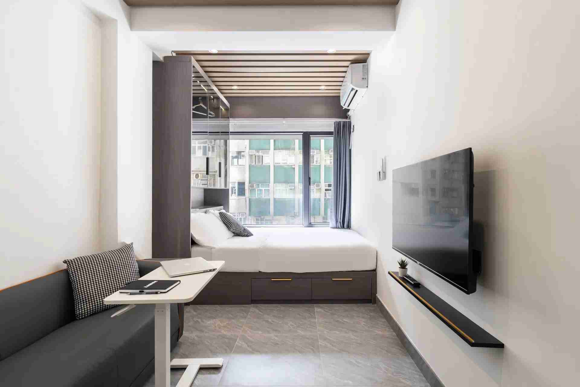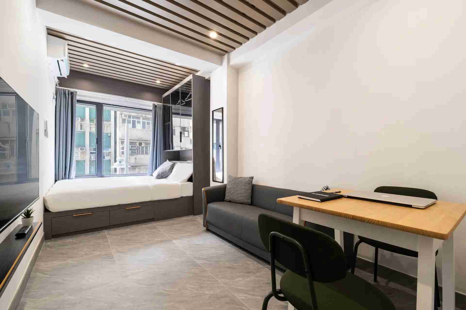 Habyt 提供位於西營盤的精美設計單間公寓,讓您體驗高尚的都市生活 🌆。這個陽光充足的單位擁有寬敞的內部空間,配備豪華的雙人床、定制衣櫃解決方案和優雅的客廳 🌞🛏️。現代化的小廚房配有高檔設備,精緻的獨立衛浴提供額外的舒適與便利 🚿🍽️。